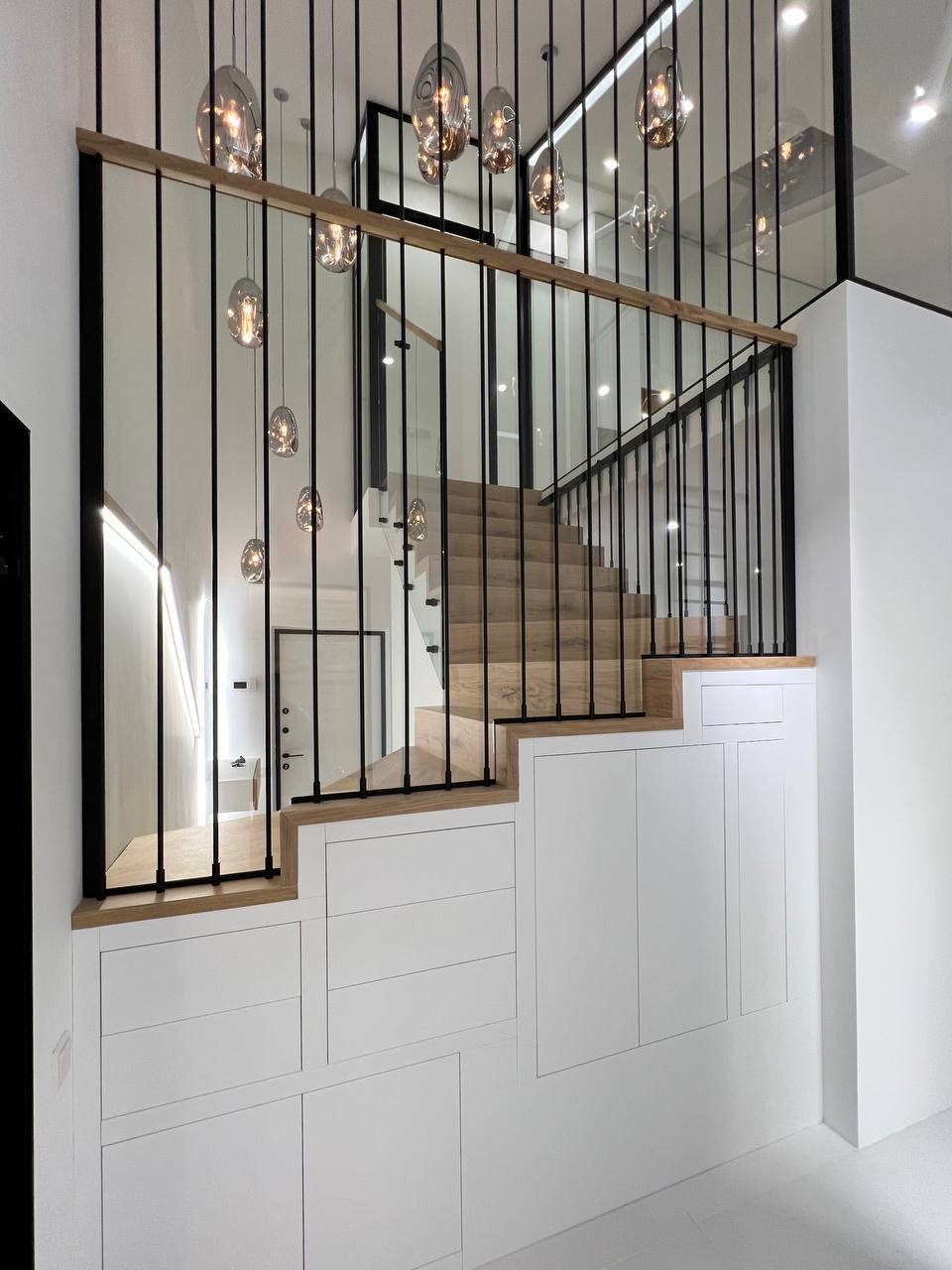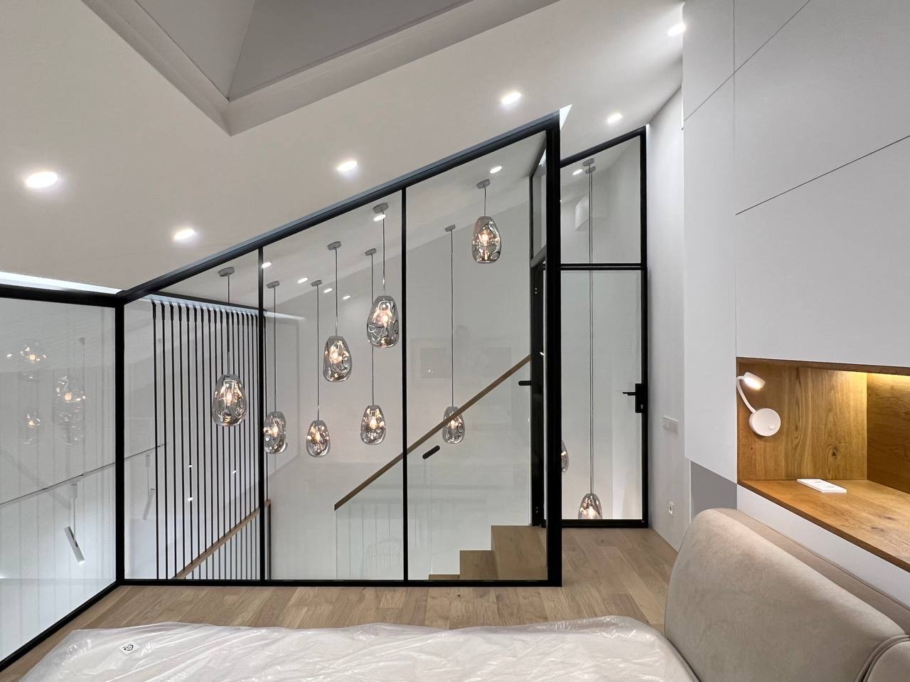 Проект: Стекло закаленное 10,12 мм, профиль алюминиевый RAL 9005black, telescopic partition system Italy, металлоконструкции струнные.