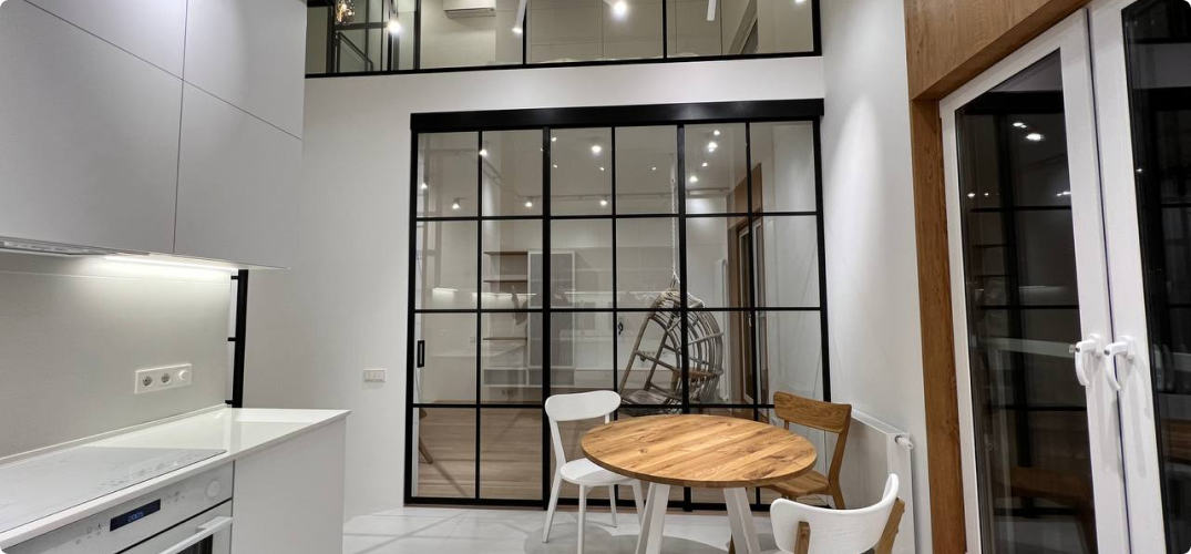 Системы:  Лофт перегородки и ограждения из стекла и металлоконструкций | Телескопические перегородки из стекла